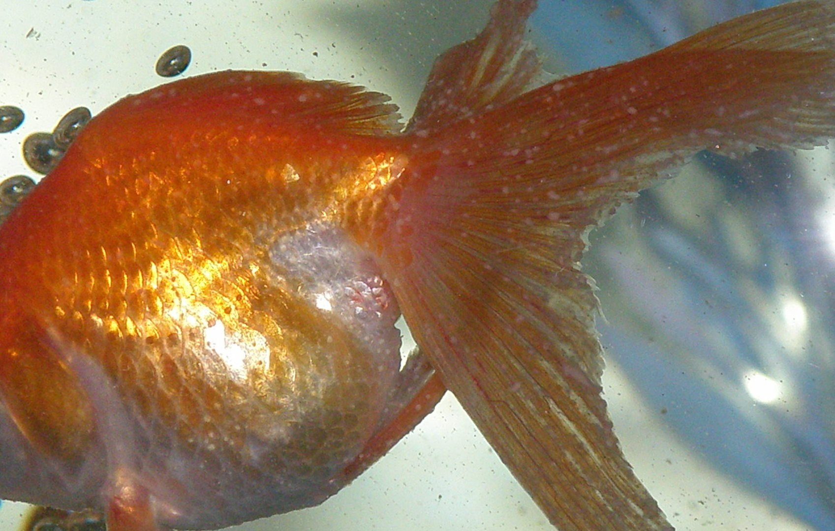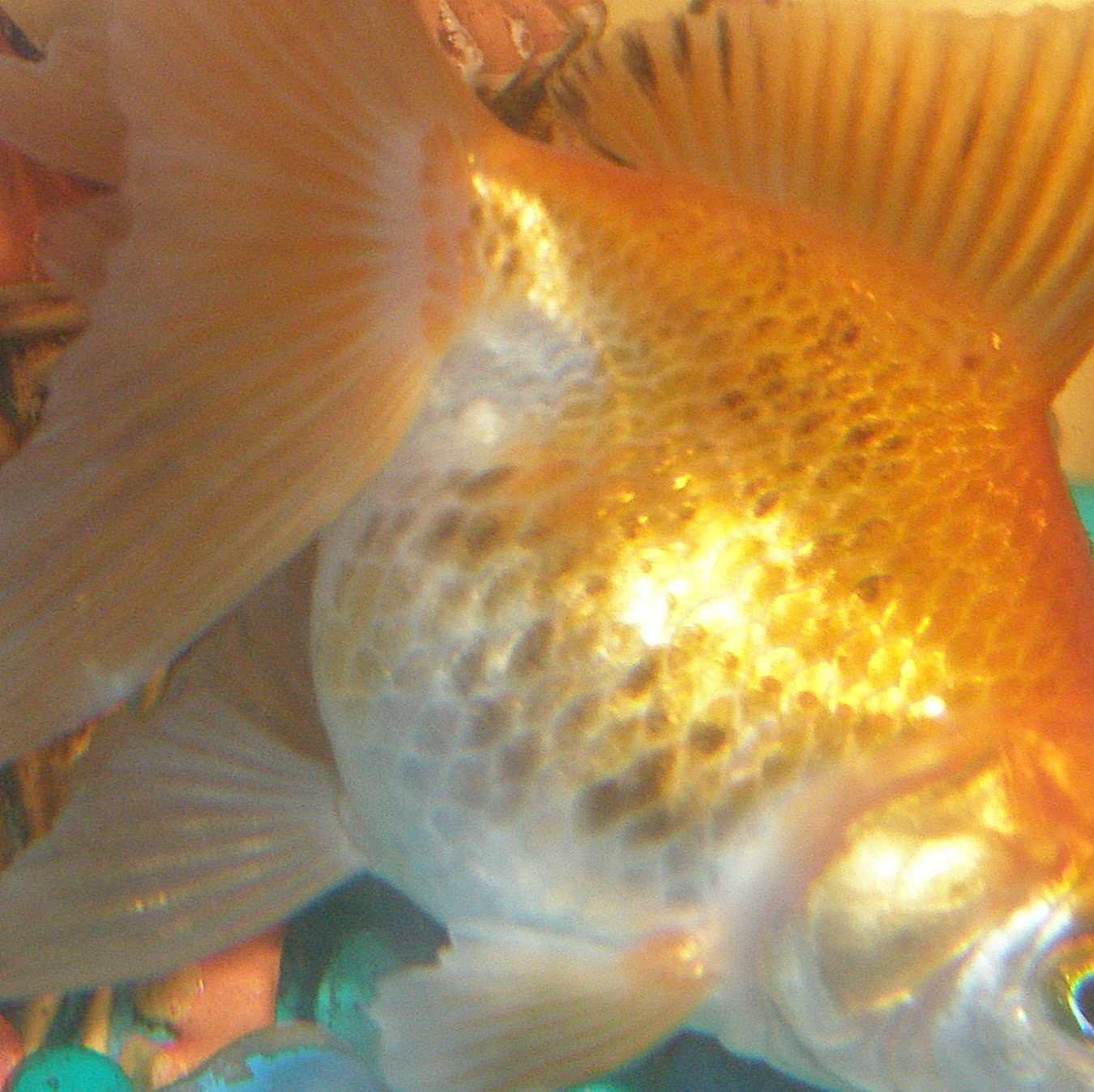 niestety od kilku dni welonka pokrywa się ciemnymi plamkami --włącznie z ogonem i górną płetwą(zdiecie 2 ), nie sa wypukłe ani wklęsłe, nie jest już osowiała apetyt także jej dopisuje;poza plamkami nie ma innych niepokojacych objawów--czy to może jakaś nowa choroba , pozostałość po ospie czy zwykła zmiana ubarwienia???