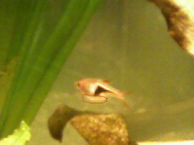zdjęcie jest robione tel, bardzo nie wyraźne, ale zaznaczyłem czerwonym "kółkiem" gdzie brzuch jest biały, rybka strasznie "wypchana jest"