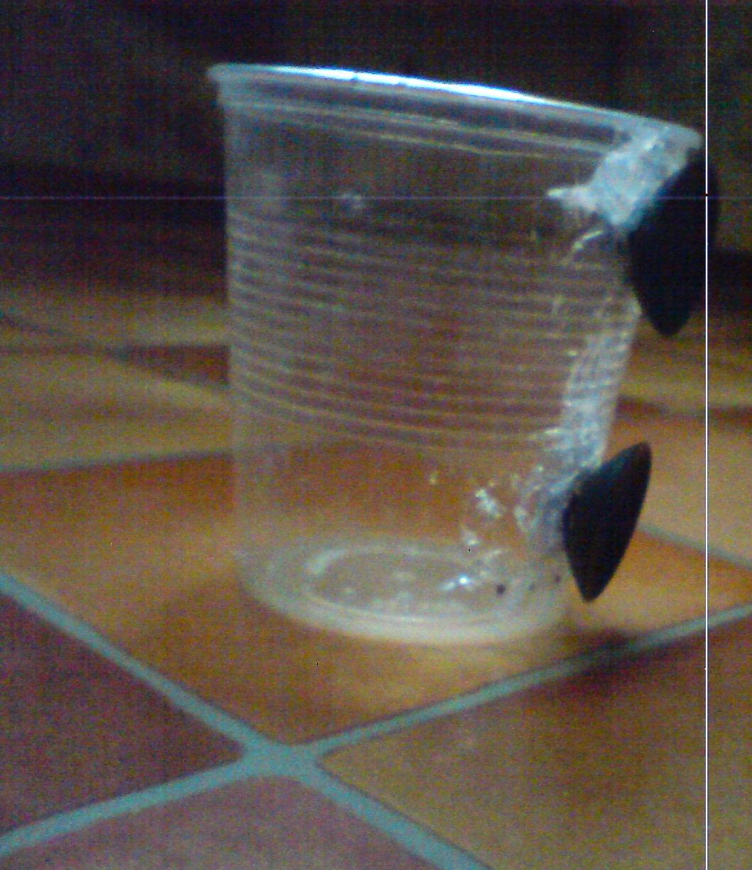 2.Bierzemy klej i starannie przyklejamy przyssawki do kubka. Najlepiej zrobić dziurę w kubku i włożyc przyssawkę i skleić od środka.
