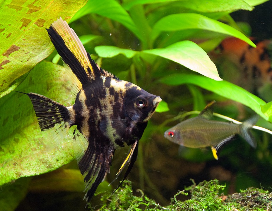Są już wszystkie ryby, które mają być, czyli 6 skalarów - czekam aż się dobiorą w pary, 1 samiec kakadu + 3 samice (jedna ma już potomstwo), 3 otoski, 3 kiryski sterby, 15 tetr lemonów, 4 bardzo młode bocje karłowate, 1 kosiarka tzw. prawdziwa, 1 kosiarka tzw. fałszywa (flying fox), 1 duży ślimak ampularia, 10 ślimaków helena (assassin snail) + potomstwo (ile nie wiem, widziałem jednego).