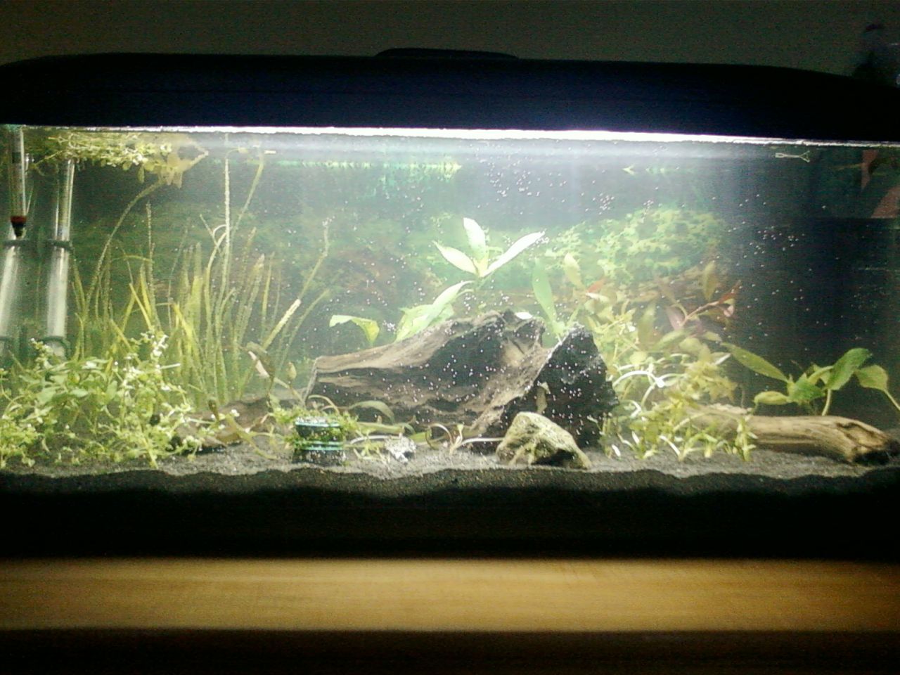 Akwarium wygląda nieźle, masz sporo zieleni na start i odpowiednie oświetlenie. Proponuje od razu ruszyć z CO2 i nie cackać się z świeceniem po 6h dziennie. Zapobiegniesz glonom, rośliny szybciej wybiją a to ważne zwłaszcza na początku.