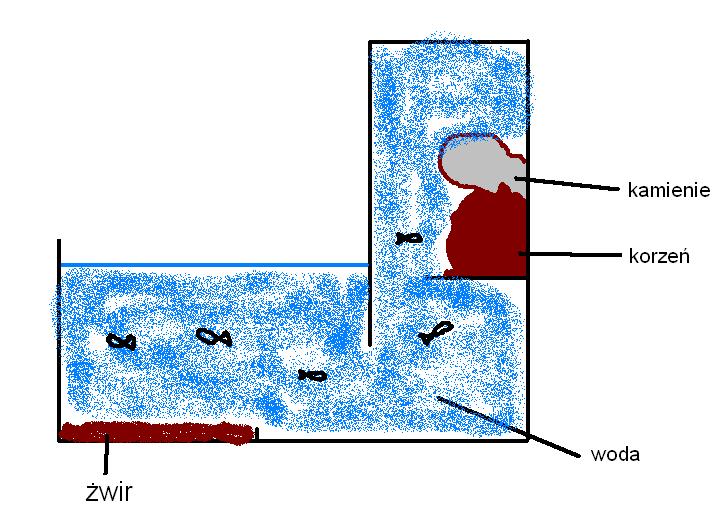 Przecież to proste... Akwarium od boku jest w kształcie litery "L". ryby mogą sobie wpływac i wypływać, a korzenie i kamienie leżą na półeczce. Starałem się w paincie pokazać o co chodzi Tongue
